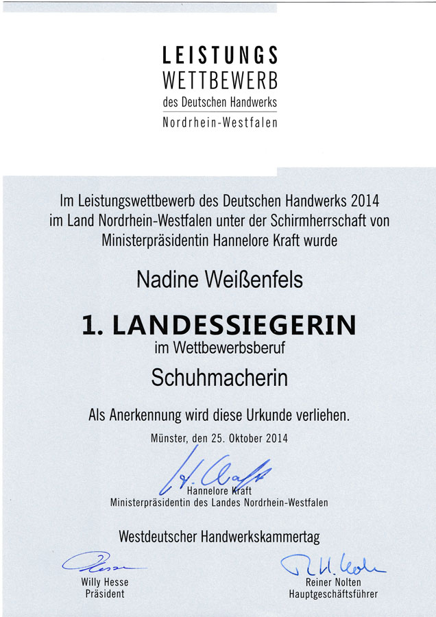 Im Jahr 2011 bin ich meine Ausbildung zur Schuhmacherin eingestiegen. Schon während meines Praktikums im Betrieb habe ich mich der Herausforderung gestellt ein Paar Kinderschuhe zu fertigen. Während der gesamten Ausbildungszeit war es für mich wichtig, das Handwerk des Schuhmachers in allen Bereichen zu erlernen . Nach der erfolgreich bestandenen Gesellenprüfung im schriftlichen sowie im praktischen Teil folgte der Kammersieg. Als Kammersiegerin 2014 konnte ich mich nun für den Leistungswettbewerb bewerben und wurde Landessiegerin in NRW. Das Gesellenstück wurde dann nochmals von einer Jury gesichtet, die den Preis für Kreativität und Design „Die gute Form im Handwerk“ vergibt. Hierbei erreichte ich den 2. Platz im Bundeswettwerb.
